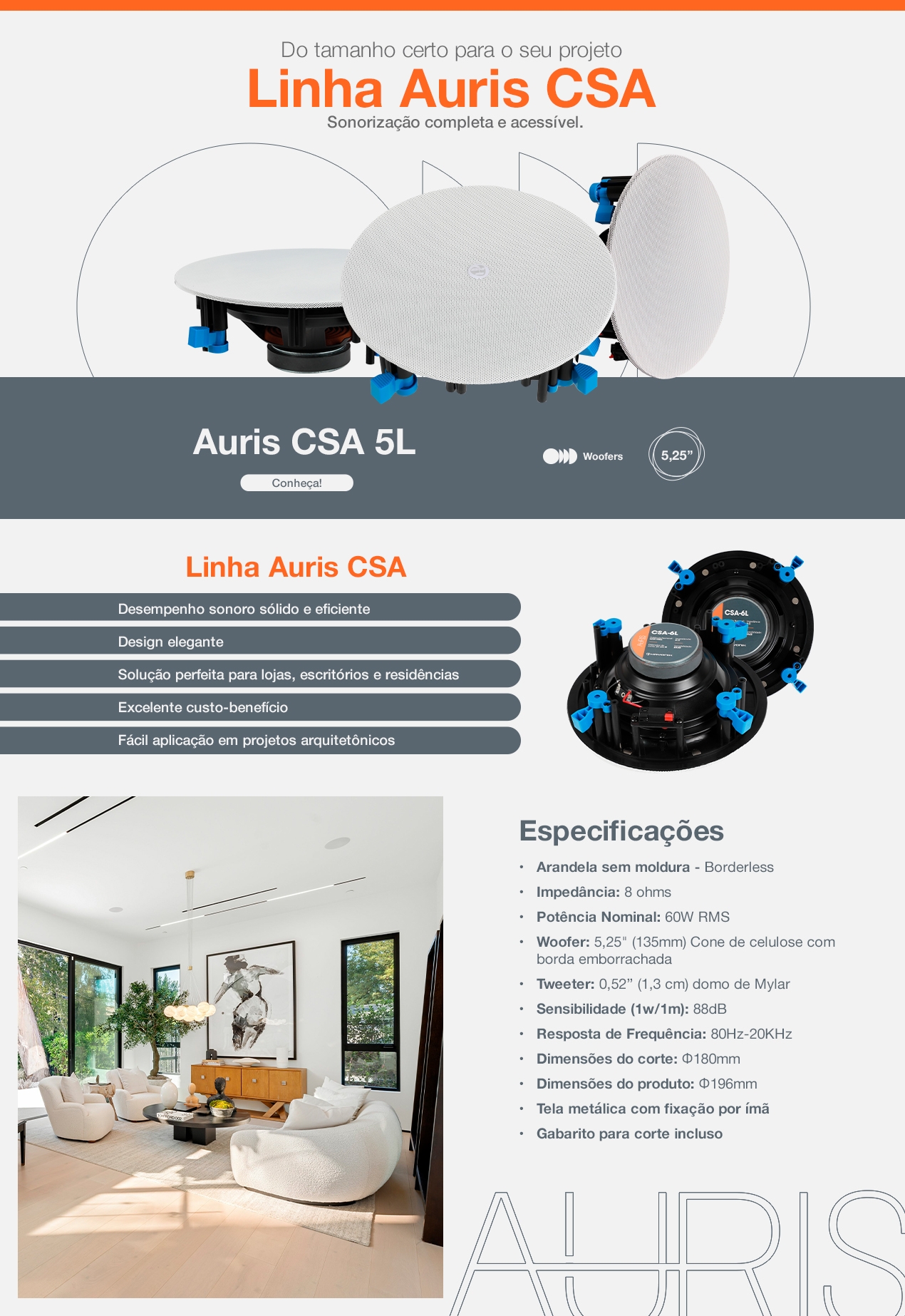 Com fácil aplicação em projetos arquitetônicos, a CSA-5L é perfeita para quem busca uma opção prática e funcional, que atenda às necessidades de áudio de diferentes ambientes, sem abrir mão de um visual sofisticado.