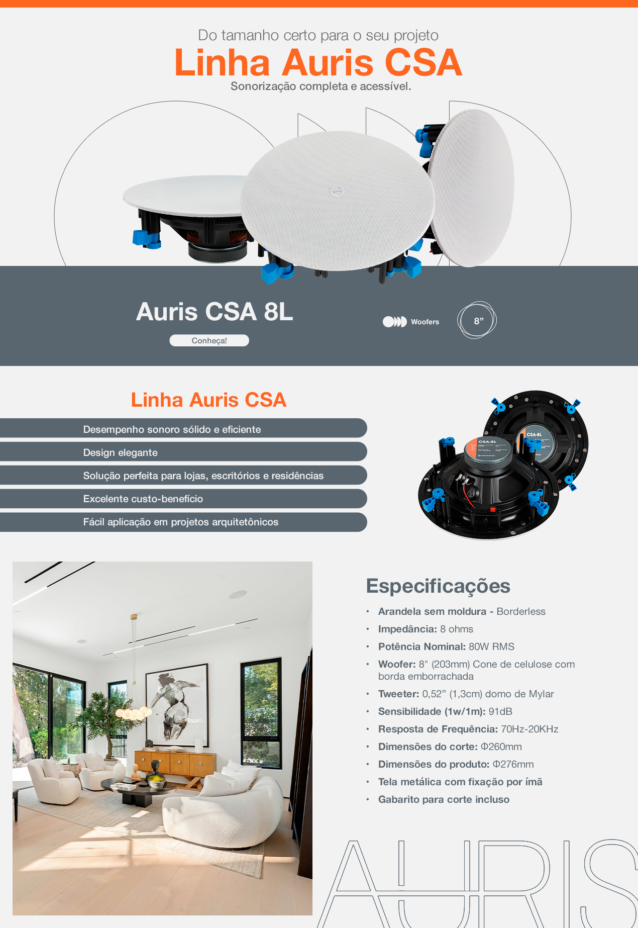 Com fácil aplicação em projetos arquitetônicos, a CSA-8L é perfeita para quem busca uma opção prática e funcional, que atenda às necessidades de áudio de diferentes ambientes, sem abrir mão de um visual sofisticado.