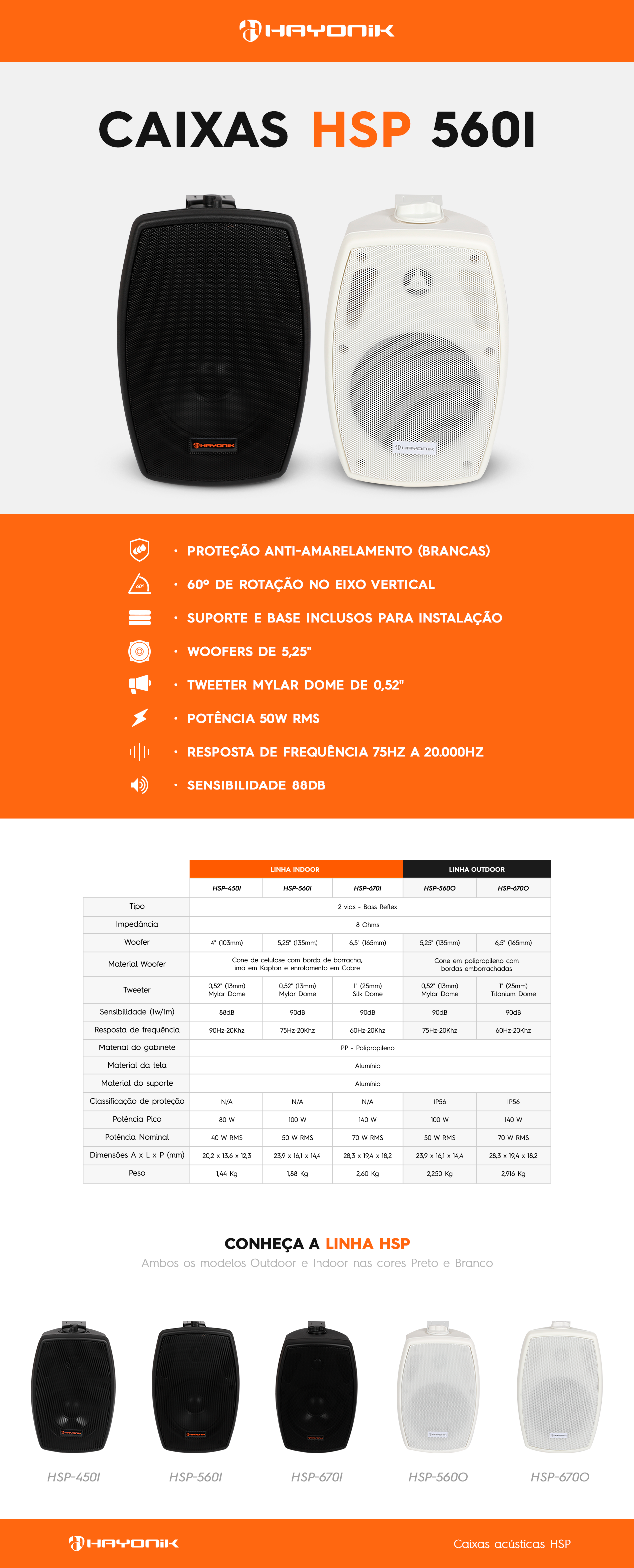 Com proteção anti-amarelamento, a HSP-560IB mantém sua aparência impecável ao longo do tempo, mesmo em ambientes com exposição à luz. Sua rotação de 60º no eixo vertical permite ajustes precisos para otimizar a distribuição sonora. Além disso, este modelo acompanha suporte e base para instalação, facilitando o processo de montagem. Equipado com woofers de 5,25”, a Caixa Acústica Hayonik HSP-560IB oferece uma reprodução de áudio rica e clara, atendendo aos mais exigentes padrões de qualidade.