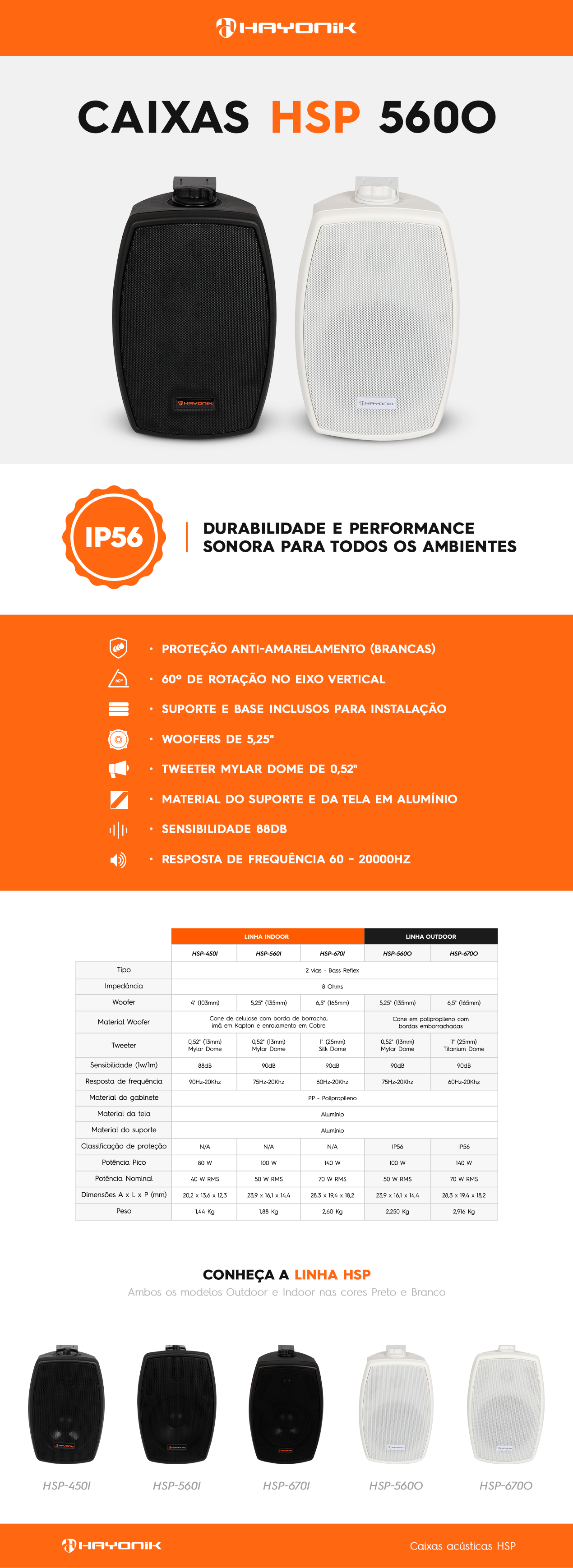Com nível de proteção IP56, a HSP-560OP é totalmente preparada para resistir às intempéries, garantindo durabilidade e performance, mesmo em condições adversas. Já o woofer de 5,25" conta com imã em Kapton, que assegura graves profundos e nítidos, enquanto o suporte biarticulado e a base inclusos oferecem praticidade e flexibilidade na instalação.