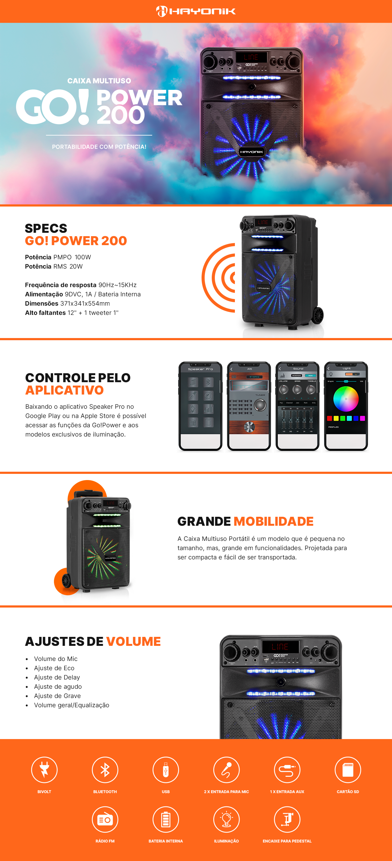 A Caixa Multiuso Portátil Hayonik Go Power 200 é um modelo que é pequena no tamanho, mas, grande em funcionalidades. Projetada para ser compacta e fácil de ser transportada. É ideal para sonorizar pequenos eventos como reuniões familiares, encontros de amigos, palestras, aulas de ginástica, entre tantas outras utilizações.